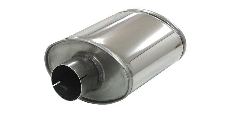 Oval fullflödesabsorptionsljuddämpare med rakt genomgående innerrör i rostfritt material.