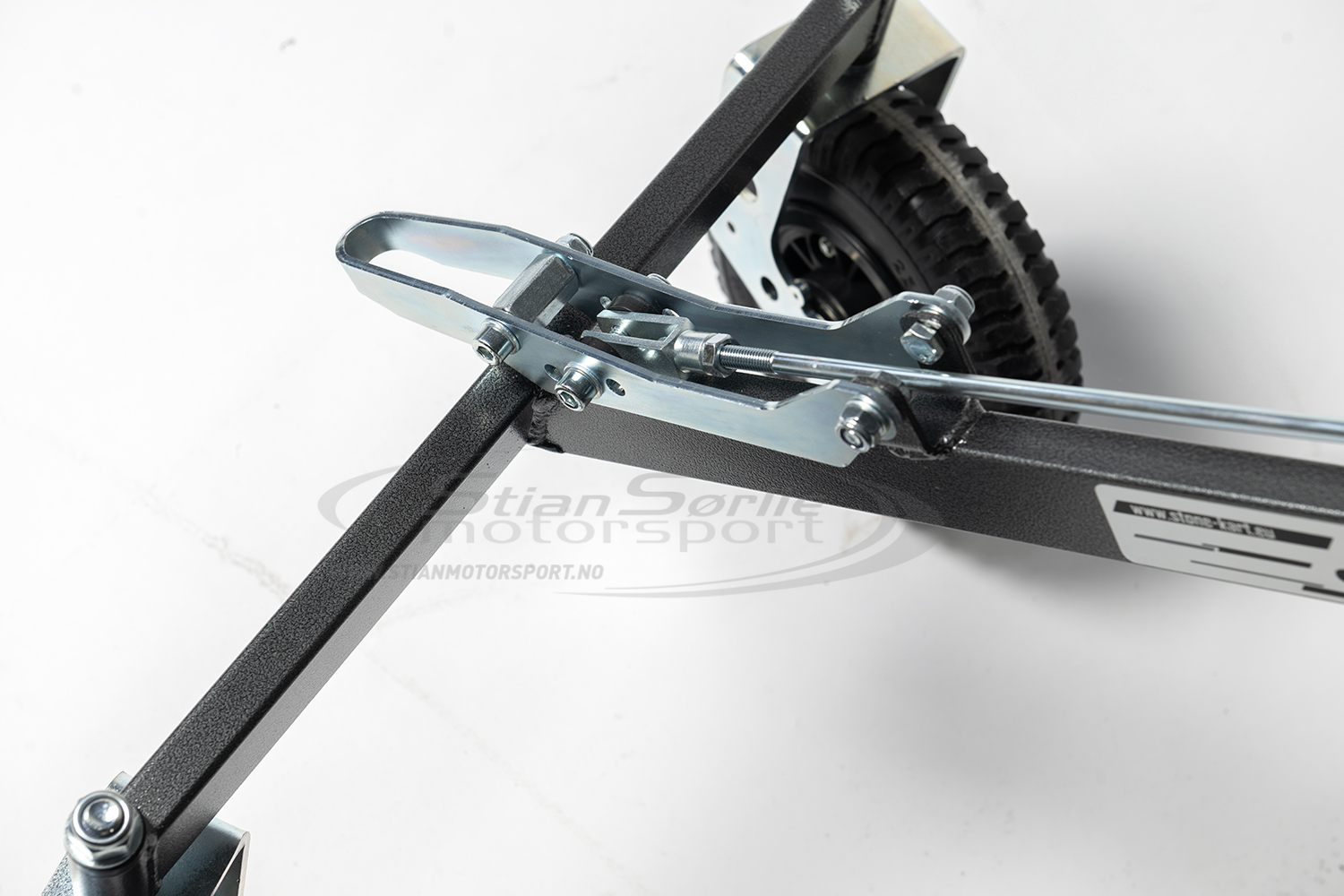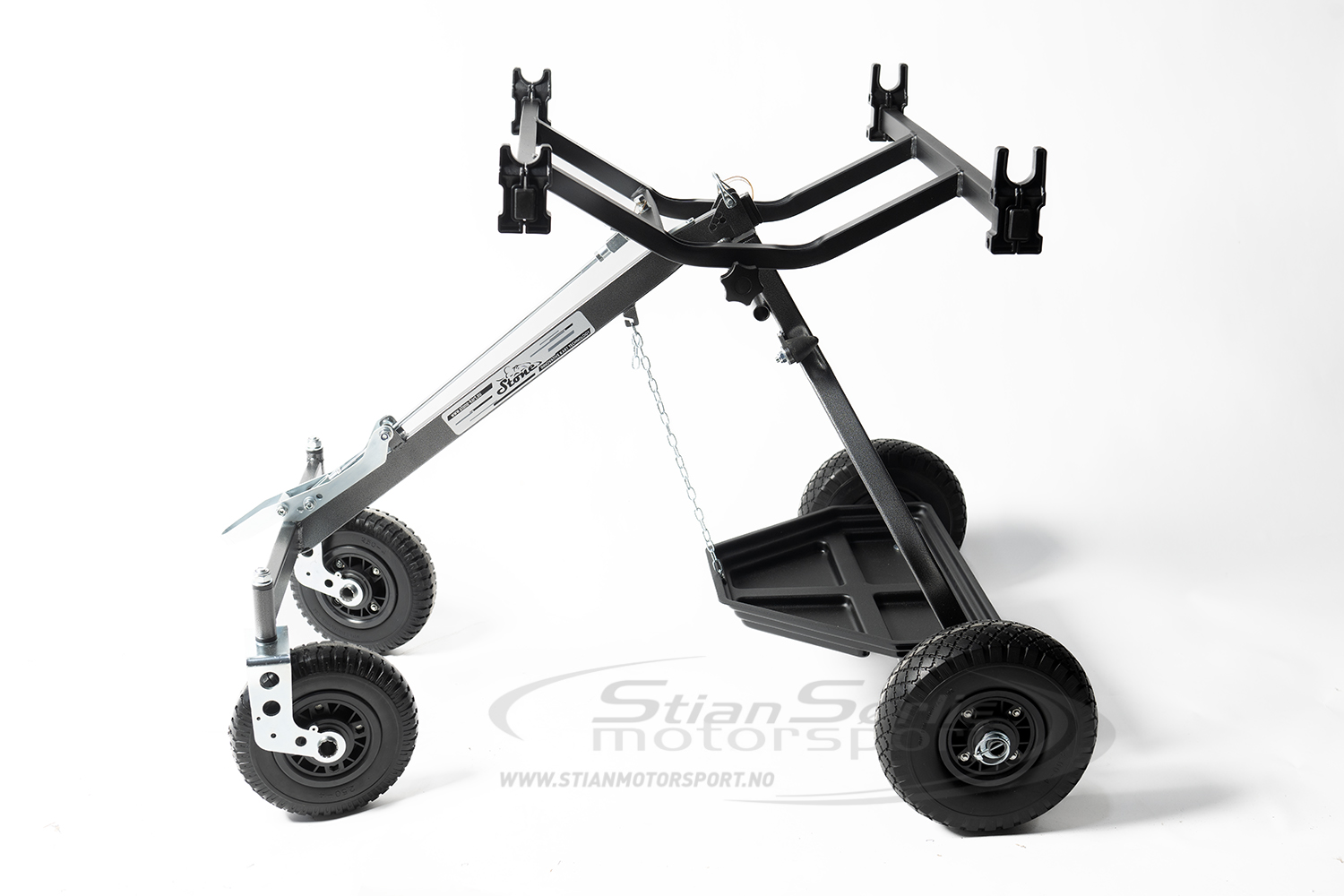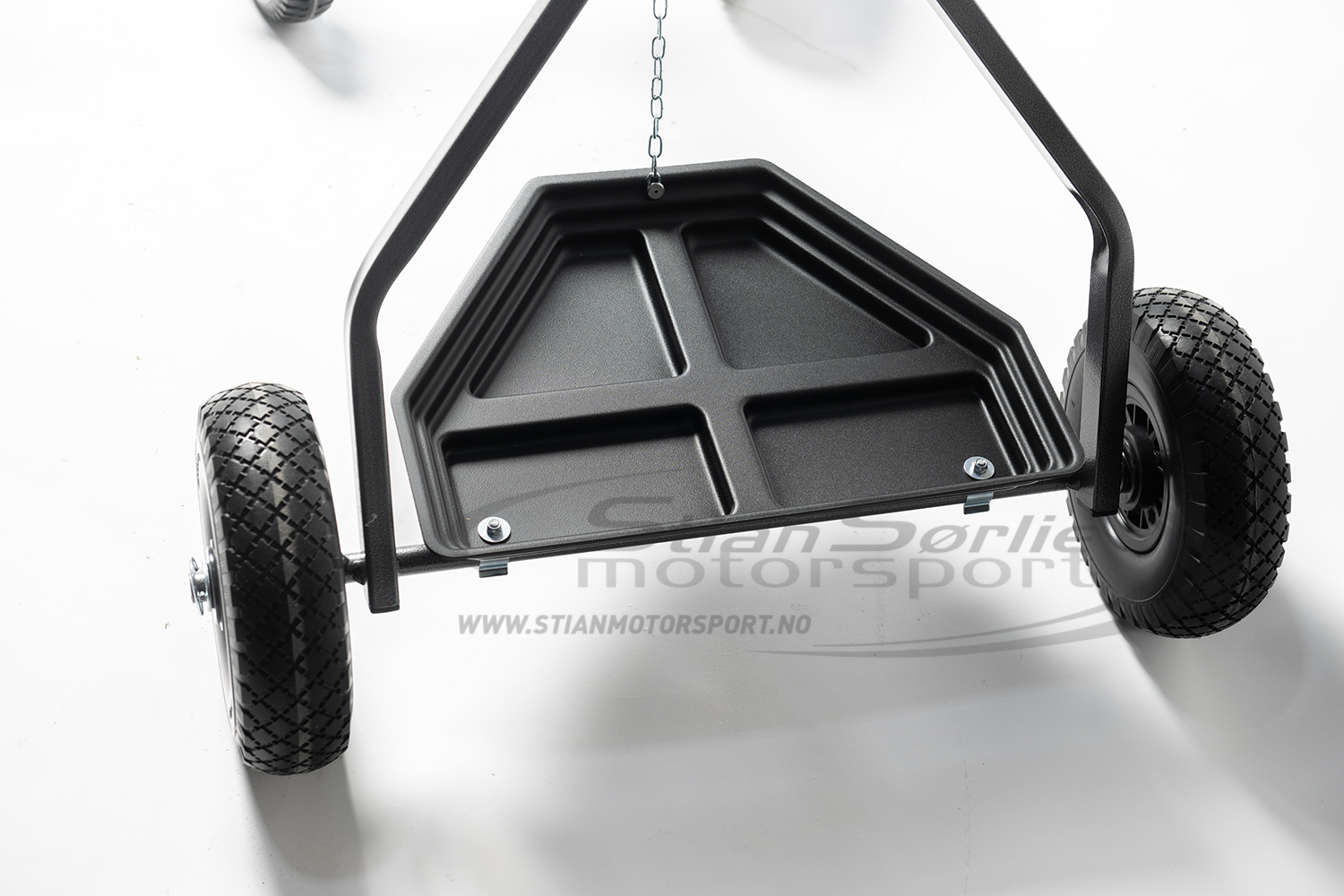 Tillverkad av stål, med stora solida polyuretanhjul med en vikt på 23 kg, kan den användas på alla CIK/FIA-homologerade chassin. Utmärkt stabilitet och hantering. Hela vagnen är förstärkt och har en lastkapacitet på 170 kg. Verktygslåda i plast medföljer.