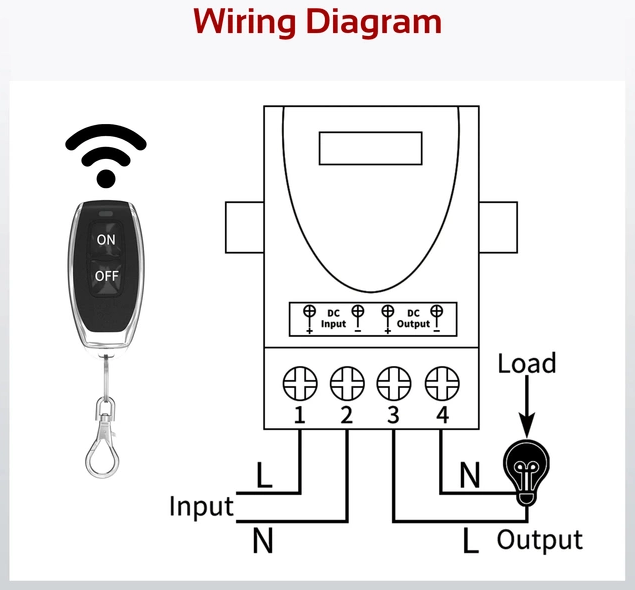 Förbrukare = Delen du önskar att kunna styra med fjärrkontroll = Delen som ska anslutas till Output Plus (+) och Minus (-) på det fjärrstyrda reläet.